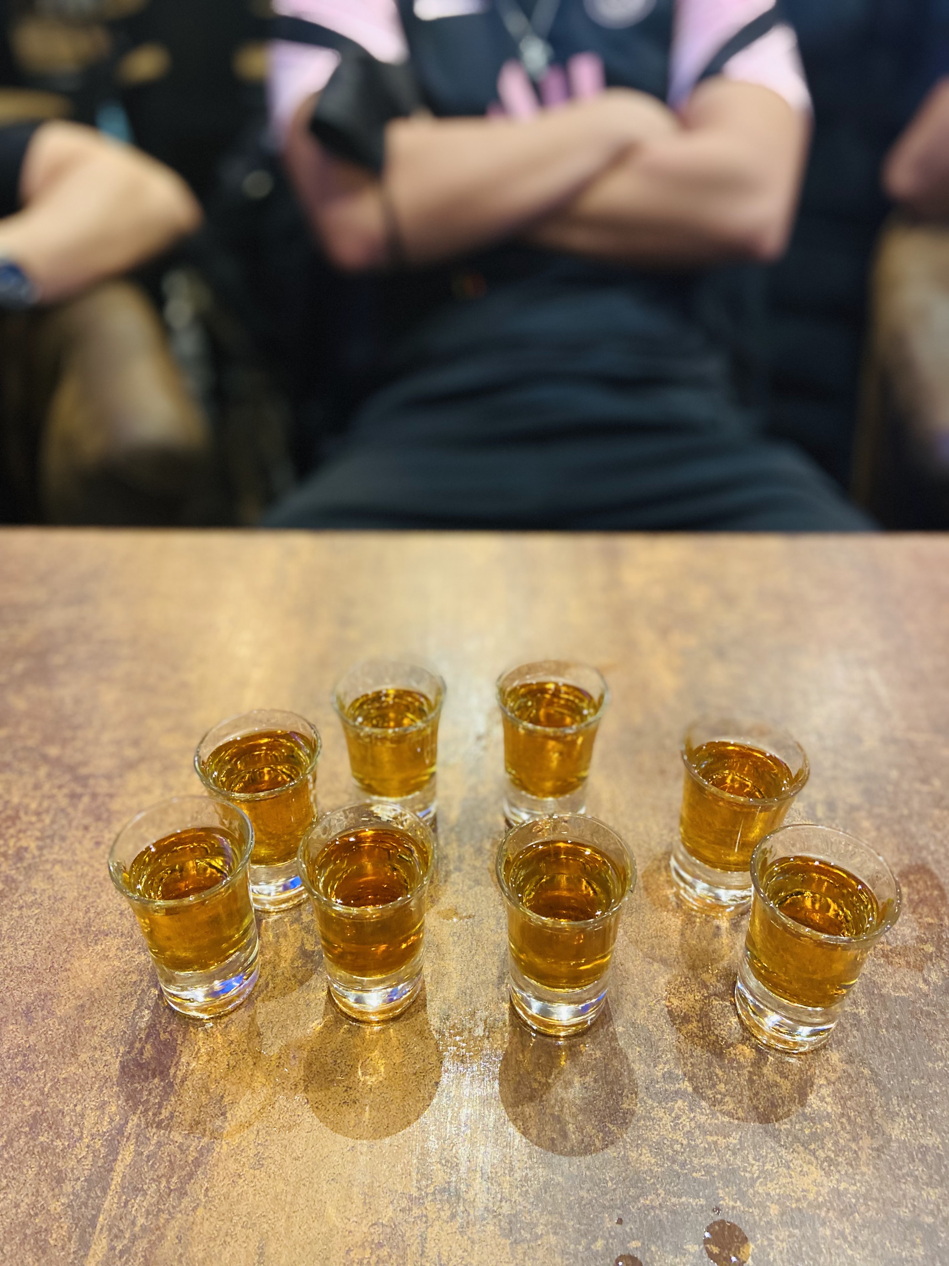 Une tournée de 6 pintes, toutes servies sans mousse, mais 1 cm en-dessous du marqueur. dommage...