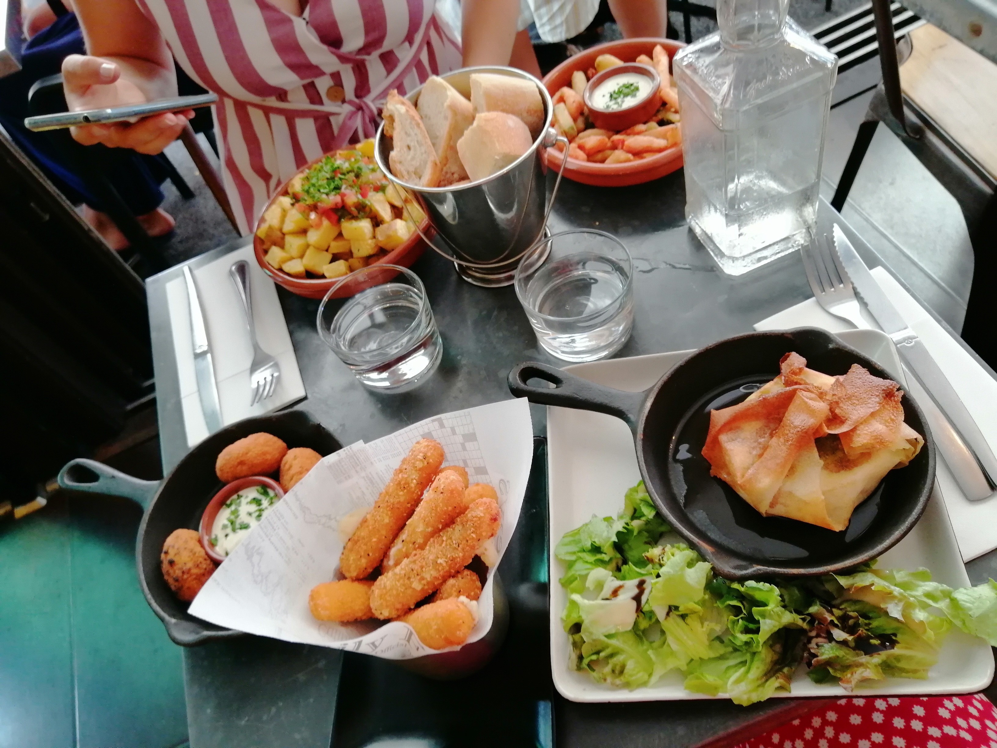 Moules, croquettes, bâtonnets de poulet et salades. Tout est riche. Bon service et dîner au milieu de la rue, en plein air. Recommandé pour les familles.